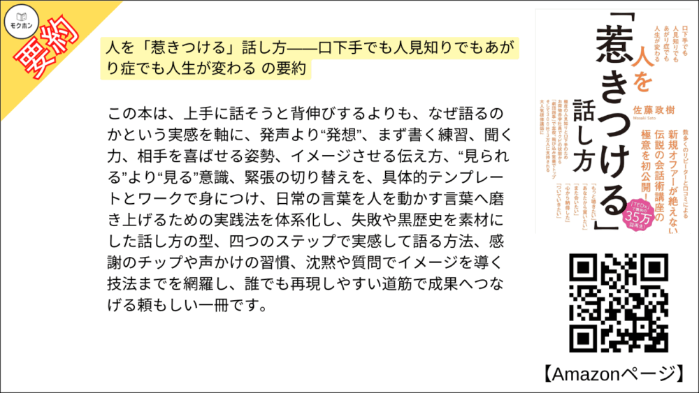 【全目次】人を「惹きつける」話し方――口下手でも人見知りでもあがり症でも人生が変わる / 佐藤 政樹【要約・もくじ・評価感想】 #人を惹きつける話し方 #佐藤政樹