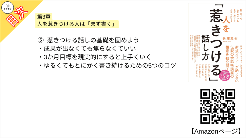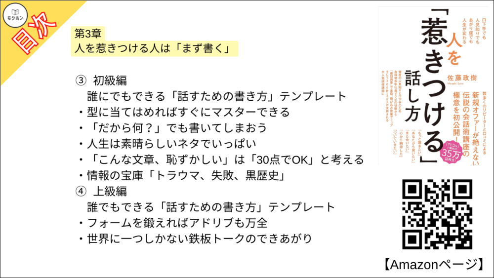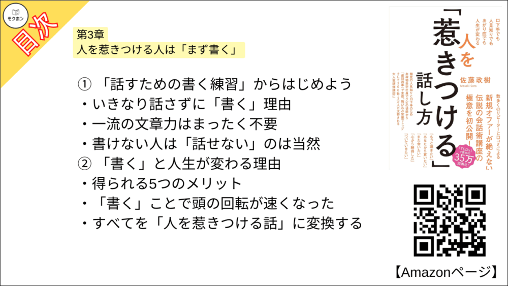 【人を「惹きつける」話し方――口下手でも人見知りでもあがり症でも人生が変わる 目次】第3章 人を惹きつける人は「まず書く」【佐藤 政樹・要点・もくじ・モクホン】