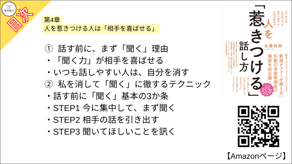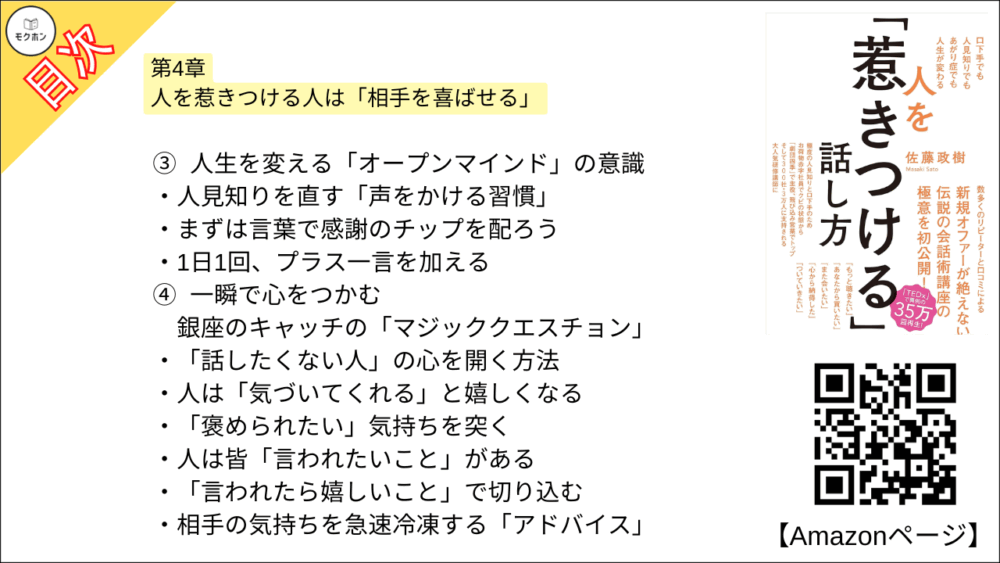 【人を「惹きつける」話し方――口下手でも人見知りでもあがり症でも人生が変わる 目次】第4章 人を惹きつける人は「相手を喜ばせる」【佐藤 政樹・要点・もくじ・モクホン】