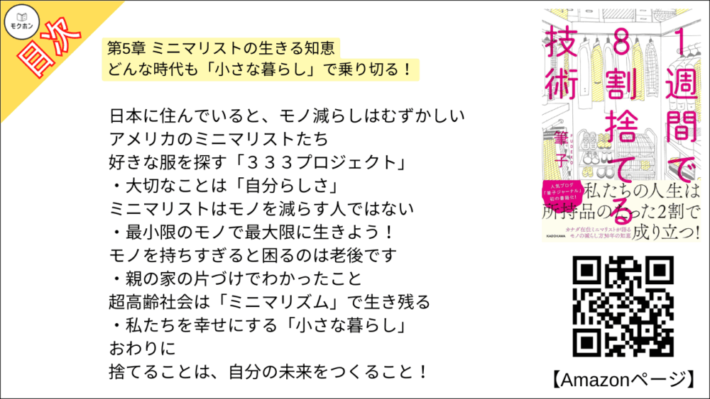 【1週間で8割捨てる技術 目次】第5章 ミニマリストの生きる知恵【筆子・要点・もくじ・モクホン】