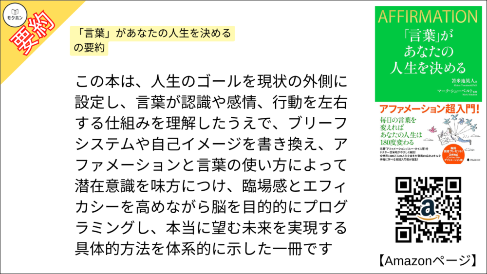この本は、人生のゴールを現状の外側に設定し、言葉が認識や感情、行動を左右する仕組みを理解したうえで、ブリーフシステムや自己イメージを書き換え、アファメーションと言葉の使い方によって潜在意識を味方につけ、臨場感とエフィカシーを高めながら脳を目的的にプログラミングし、本当に望む未来を実現する具体的方法を体系的に示した一冊です