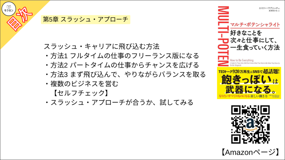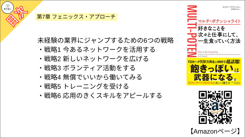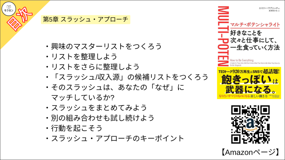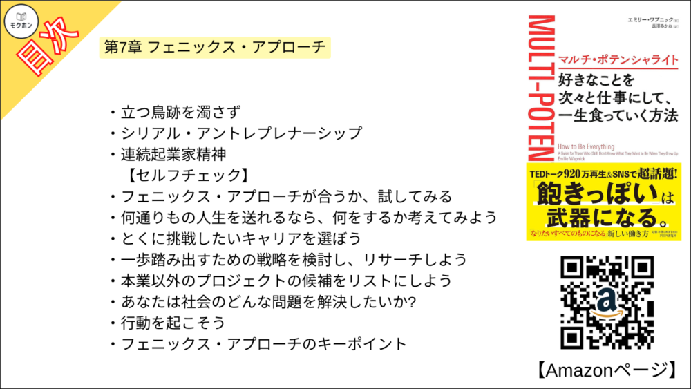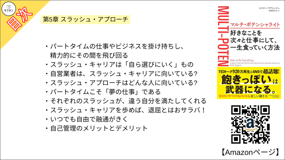 エミリー ワプニックさんの「マルチ・ポテンシャライト 好きなことを次々と仕事にして、一生食っていく方法」の全もくじを紹介します。