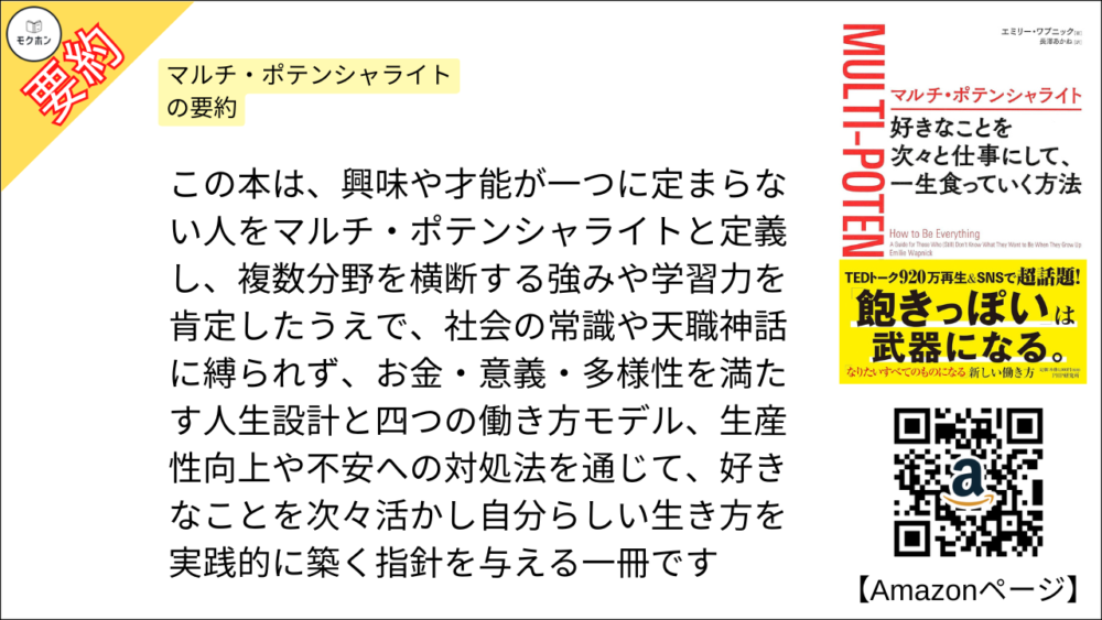 この本は、興味や才能が一つに定まらない人をマルチ・ポテンシャライトと定義し、複数分野を横断する強みや学習力を肯定したうえで、社会の常識や天職神話に縛られず、お金・意義・多様性を満たす人生設計と四つの働き方モデル、生産性向上や不安への対処法を通じて、好きなことを次々活かし自分らしい生き方を実践的に築く指針を与える一冊です