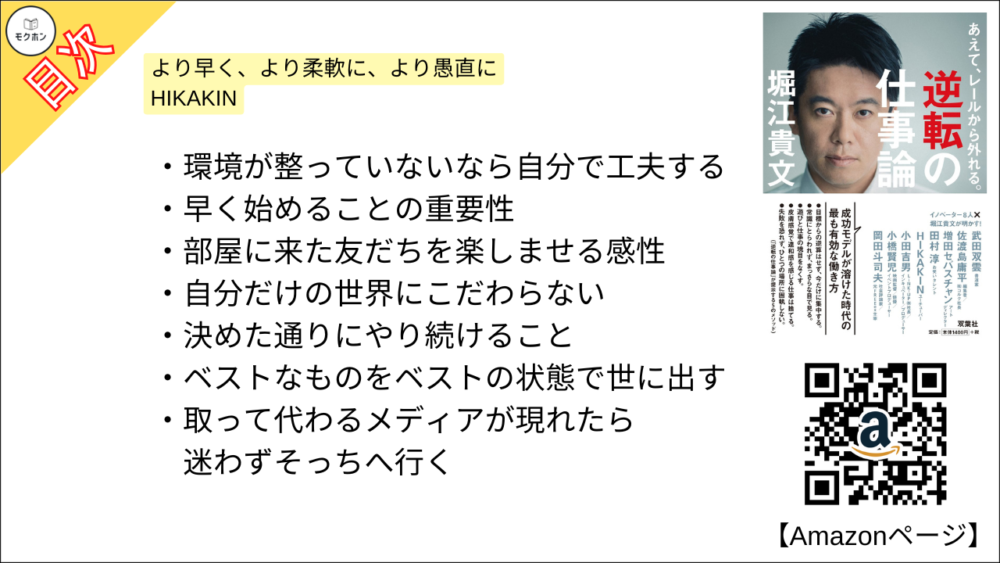 【あえて、レールから外れる。逆転の仕事論 目次】より早く、より柔軟に、より愚直に – HIKAKIN【堀江貴文(ホリエモン)・要約・もくじ・モクホン】