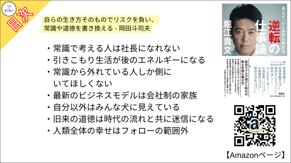 【あえて、レールから外れる。逆転の仕事論 目次】自らの生き方そのものでリスクを負い、常識や道徳を書き換える – 岡田斗司夫【堀江貴文(ホリエモン)・要約・もくじ・モクホン】