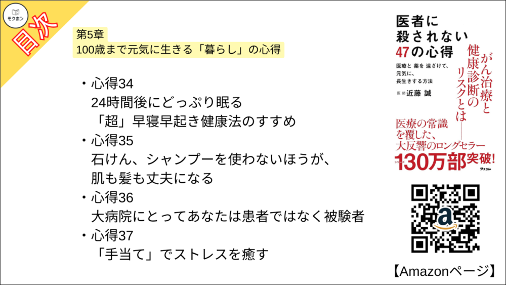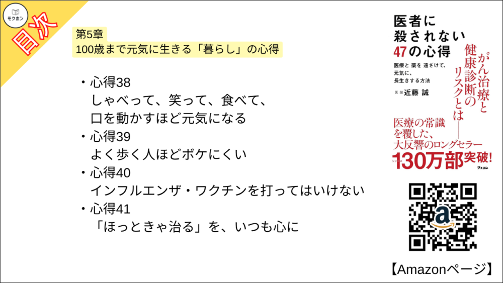 【医者に殺されない47の心得 目次】第5章 100歳まで元気に生きる「暮らし」の心得【近藤 誠・要約・もくじ・モクホン】