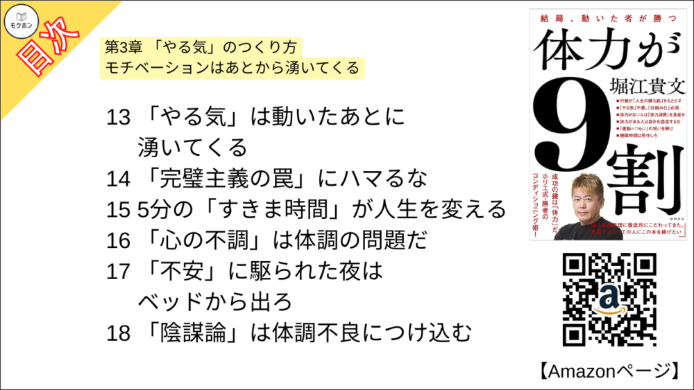 堀江 貴文さんの「体力が9割 結局、動いた者が勝つ」の全もくじを紹介します。