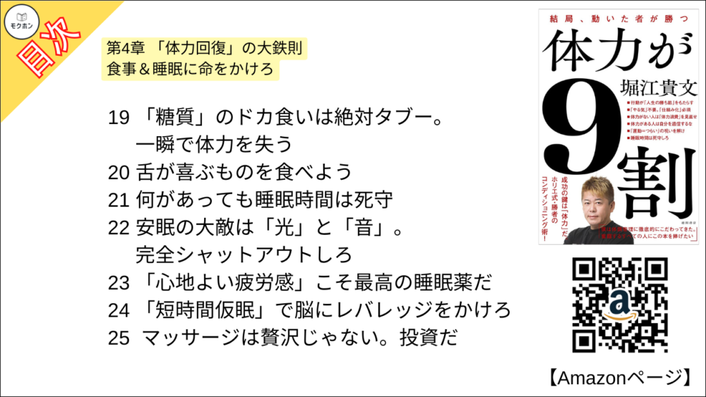 【体力が9割 結局、動いた者が勝つ 目次】第4章 「体力回復」の大鉄則 – 食事&睡眠に命をかけろ【堀江貴文(ホリエモン)・要約・もくじ・モクホン】