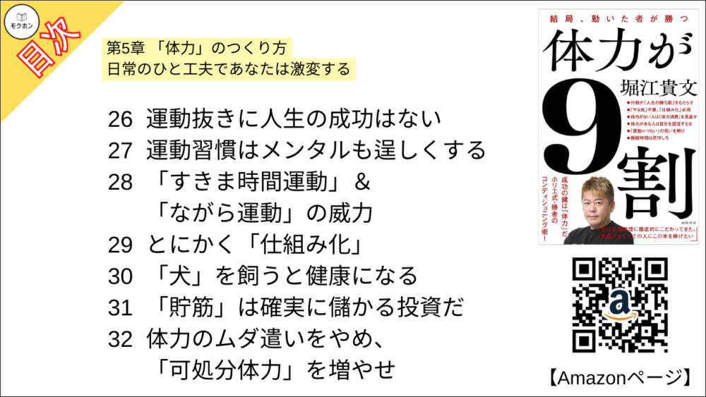 【体力が9割 結局、動いた者が勝つ 目次】第5章 「体力」のつくり方 – 日常のひと工夫であなたは激変する【堀江貴文(ホリエモン)・要約・もくじ・モクホン】