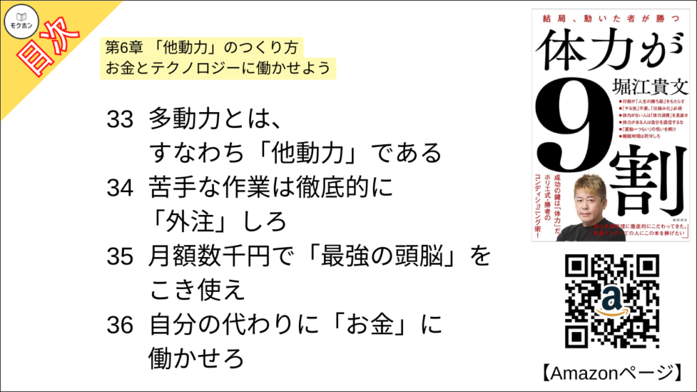【体力が9割 結局、動いた者が勝つ 目次】第6章 「他動力」のつくり方 – お金とテクノロジーに働かせよう【堀江貴文(ホリエモン)・要約・もくじ・モクホン】