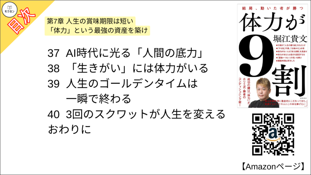 【体力が9割 結局、動いた者が勝つ 目次】第7章 人生の賞味期限は短い – 「体力」という最強の資産を築け【堀江貴文(ホリエモン)・要約・もくじ・モクホン】