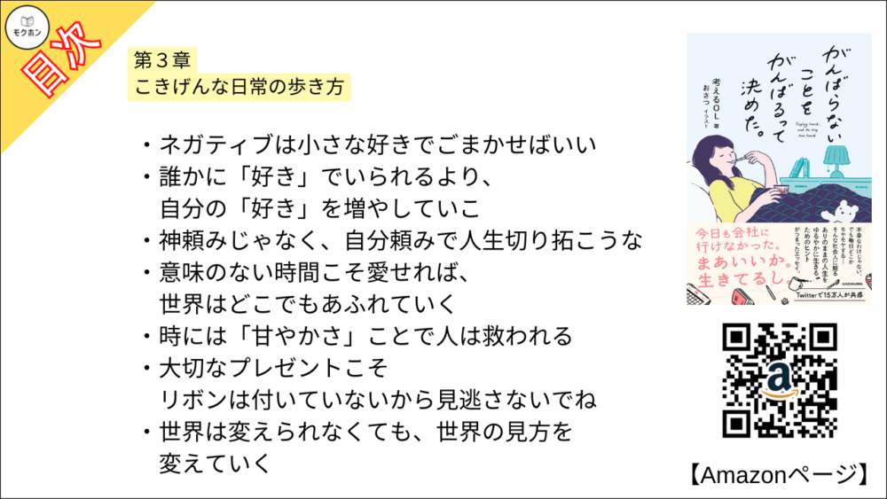 【がんばらないことをがんばるって決めた。 目次】第3章 こきげんな日常の歩き方【考えるOL・要約・もくじ・モクホン】