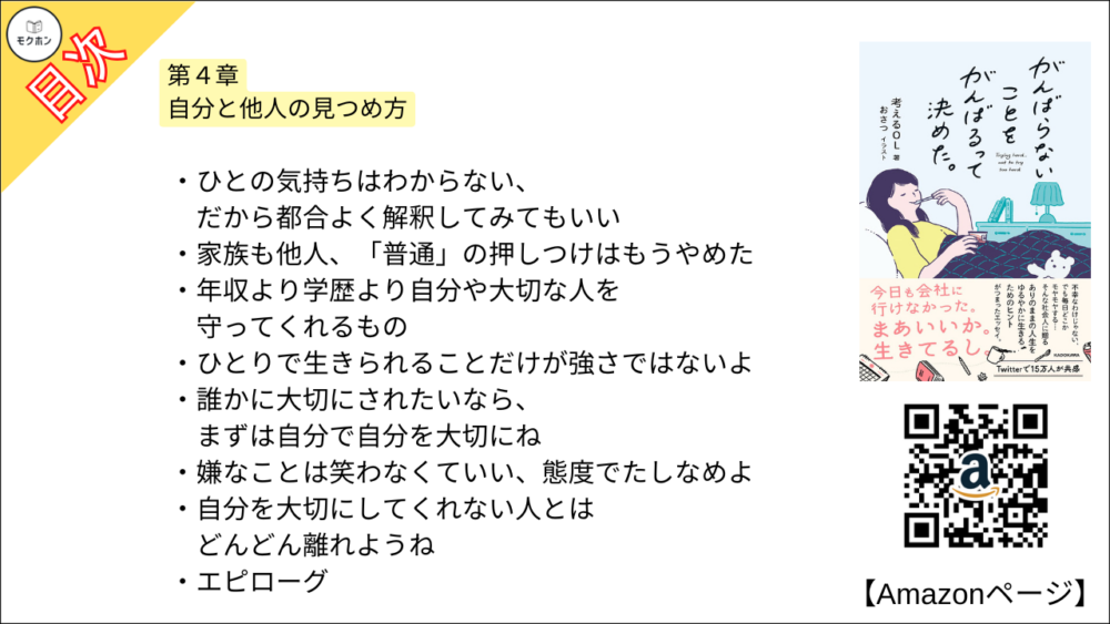 【がんばらないことをがんばるって決めた。 目次】第4章 自分と他人の見つめ方【考えるOL・要約・もくじ・モクホン】