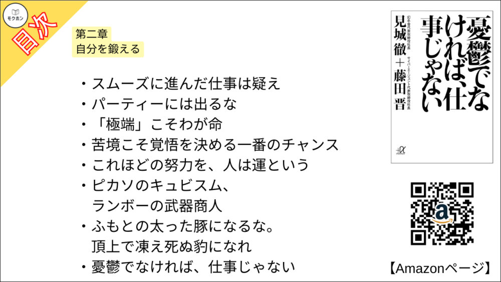 見城徹 さん、藤田晋 さんの「憂鬱でなければ、仕事じゃない」の全もくじを紹介します。