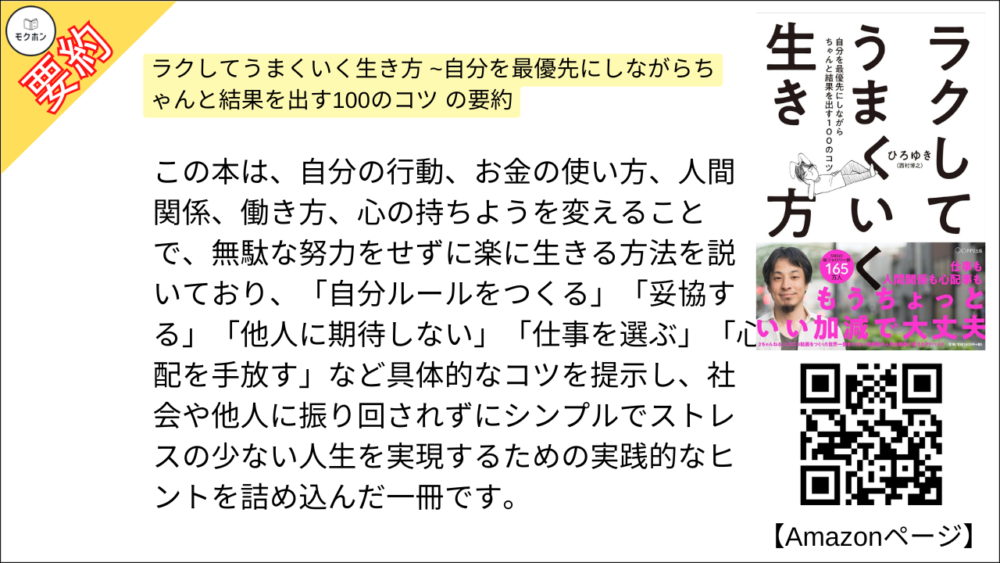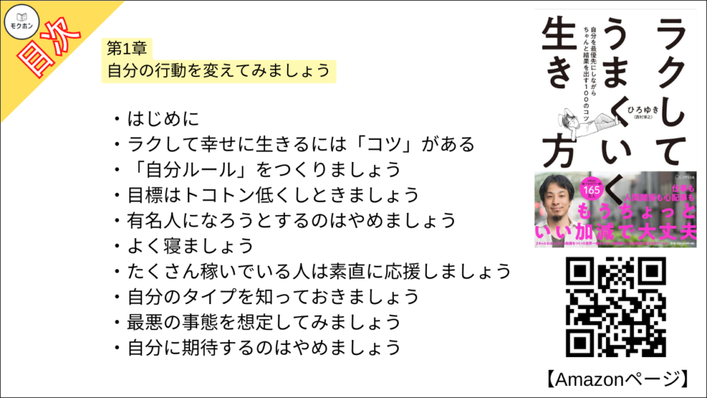 【全目次】ラクしてうまくいく生き方 自分を最優先にしながらちゃんと結果を出す100のコツ / ひろゆき(西村博之) 【要約・もくじ・評価感想】#ラクしてうまくいく生き方 #ひろゆき