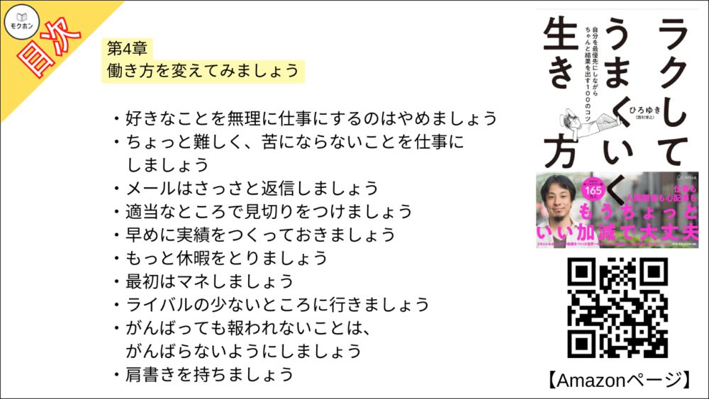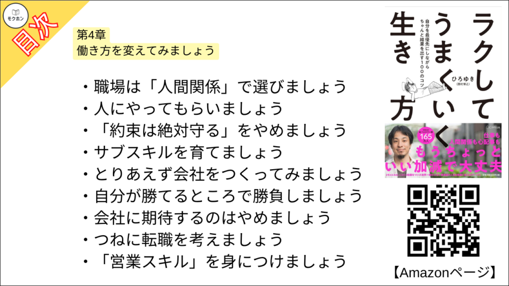 【ラクしてうまくいく生き方 目次】第4章 働き方を変えてみましょう【ひろゆき(西村博之)・要約・もくじ】