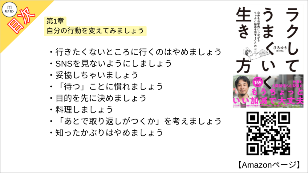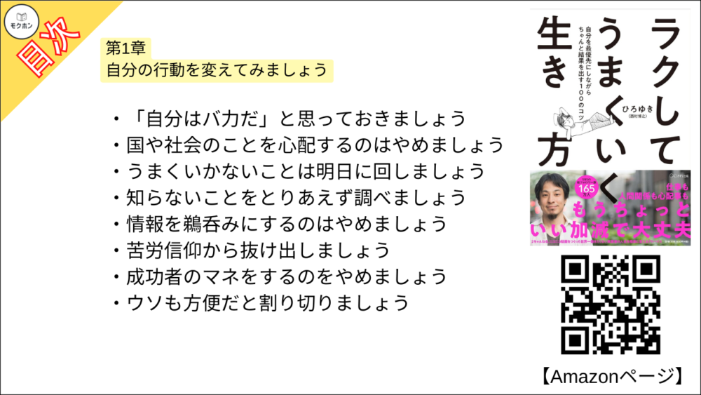 【ラクしてうまくいく生き方 目次】第1章 自分の行動を変えてみましょう【ひろゆき(西村博之)・要約・もくじ】