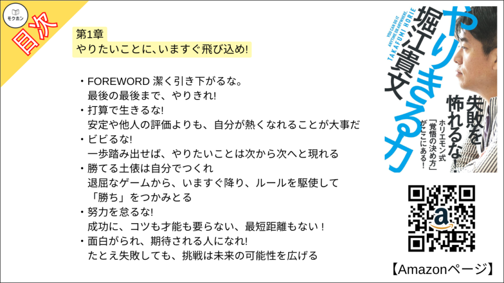【やりきる力 目次】第1章 やりたいことに、いますぐ飛び込め!【堀江貴文(ホリエモン)・要約】