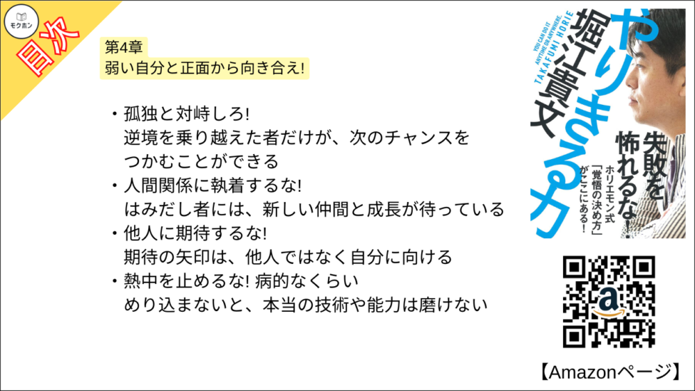 【やりきる力 目次】第4章 弱い自分と正面から向き合え!【堀江貴文(ホリエモン)・要約】