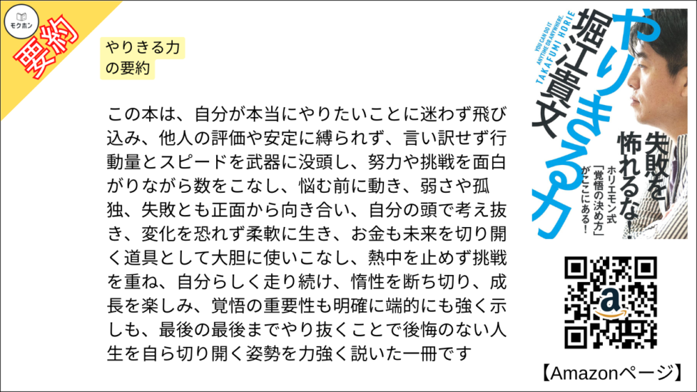 この本は、自分が本当にやりたいことに迷わず飛び込み、他人の評価や安定に縛られず、言い訳せず行動量とスピードを武器に没頭し、努力や挑戦を面白がりながら数をこなし、悩む前に動き、弱さや孤独、失敗とも正面から向き合い、自分の頭で考え抜き、変化を恐れず柔軟に生き、お金も未来を切り開く道具として大胆に使いこなし、熱中を止めず挑戦を重ね、自分らしく走り続け、惰性を断ち切り、成長を楽しみ、覚悟の重要性も明確に端的にも強く示しも、最後の最後までやり抜くことで後悔のない人生を自ら切り開く姿勢を力強く説いた一冊です