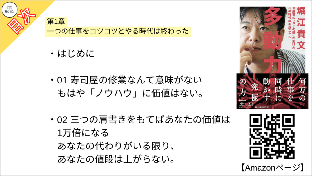 【多動力 目次】第1章 一つの仕事をコツコツとやる時代は終わった【堀江貴文(ホリエモン)・要点・もくじ】