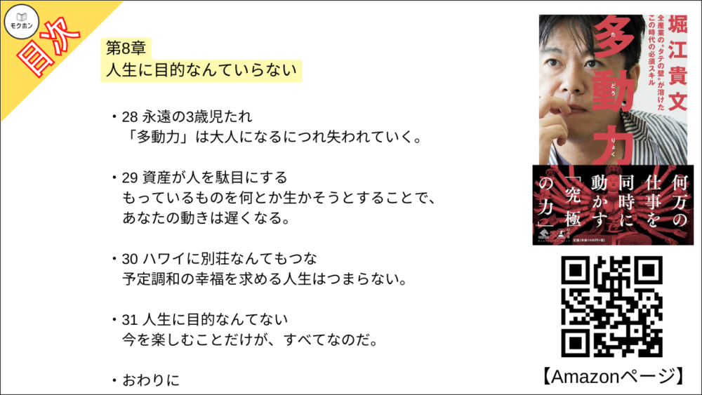 【多動力 目次】第8章 人生に目的なんていらない 【堀江貴文(ホリエモン)・要点・もくじ】