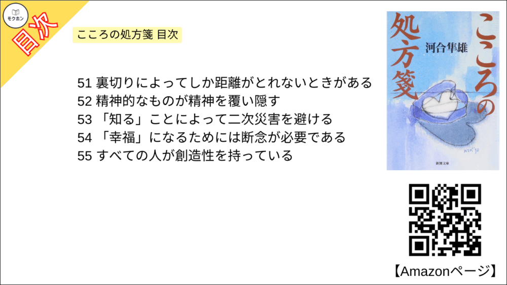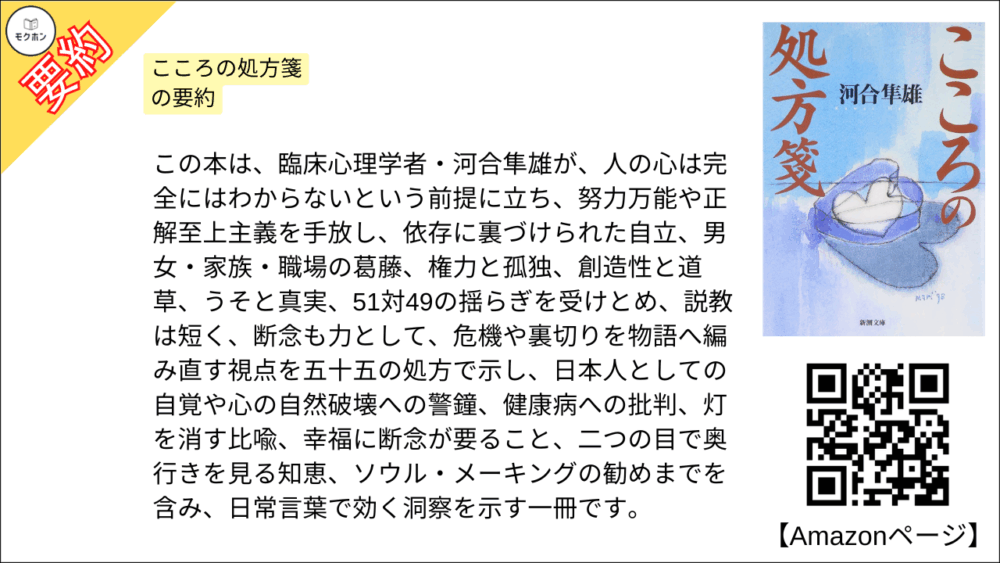 この本は、臨床心理学者・河合隼雄が、人の心は完全にはわからないという前提に立ち、努力万能や正解至上主義を手放し、依存に裏づけられた自立、男女・家族・職場の葛藤、権力と孤独、創造性と道草、うそと真実、51対49の揺らぎを受けとめ、説教は短く、断念も力として、危機や裏切りを物語へ編み直す視点を五十五の処方で示し、日本人としての自覚や心の自然破壊への警鐘、健康病への批判、灯を消す比喩、幸福に断念が要ること、二つの目で奥行きを見る知恵、ソウル・メーキングの勧めまでを含み、日常言葉で効く洞察を示す一冊です。