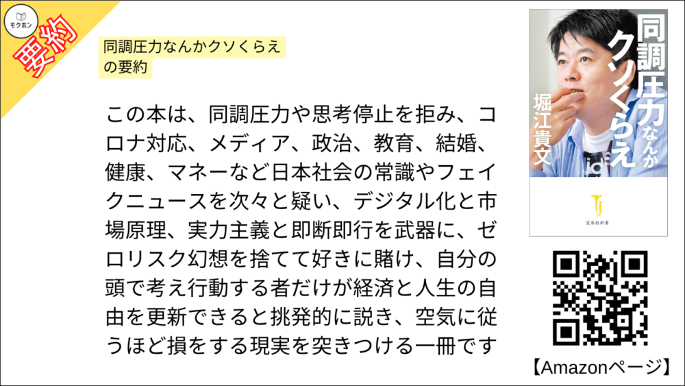 この本は、同調圧力や思考停止を拒み、コロナ対応、メディア、政治、教育、結婚、健康、マネーなど日本社会の常識やフェイクニュースを次々と疑い、デジタル化と市場原理、実力主義と即断即行を武器に、ゼロリスク幻想を捨てて好きに賭け、自分の頭で考え行動する者だけが経済と人生の自由を更新できると挑発的に説き、空気に従うほど損をする現実を突きつける一冊です