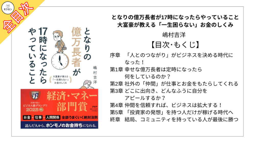 【全目次】となりの億万長者が17時になったらやっていること 大富豪が教える「一生困らない」お金のしくみ / 嶋村吉洋【要約・もくじ・評価感想】 #となりの億万長者が17時になったらやっていること #お金持ち #嶋村吉洋