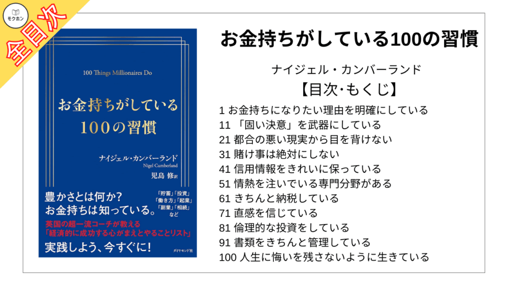 【全目次】お金持ちがしている100の習慣 / ナイジェル・カンバーランド【要約・もくじ・評価感想】#お金持ちがしている100の習慣 #ナイジェルカンバーランド