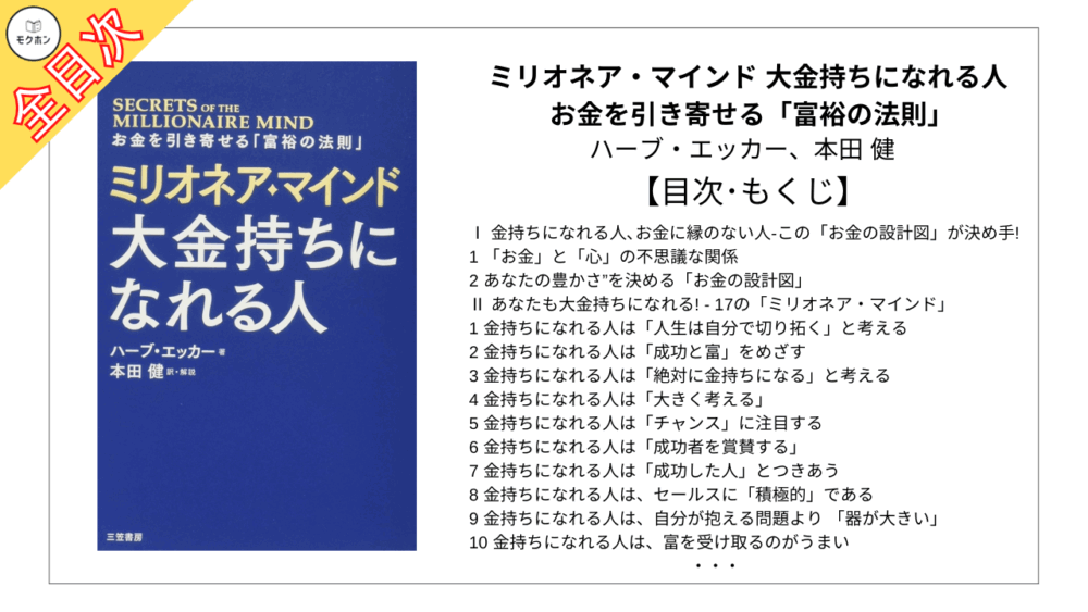 【全目次】ミリオネア・マインド 大金持ちになれる人: お金を引き寄せる「富裕の法則」 / ハーブ・エッカー【要約・もくじ・評価感想】#ミリオネアマインド #ハーブエッカー #本田健
