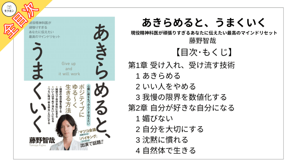 【全目次】あきらめると、うまくいく – 現役精神科医が頑張りすぎるあなたに伝えたい最高のマインドリセット / 藤野 智哉【要約・もくじ・評価感想】 #あきらめると、うまくいく #藤野智哉