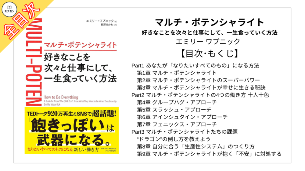 【全目次】マルチ・ポテンシャライト 好きなことを次々と仕事にして、一生食っていく方法 / エミリー ワプニック【要約・もくじ・評価感想】 #マルチポテンシャライト #エミリーワプニック